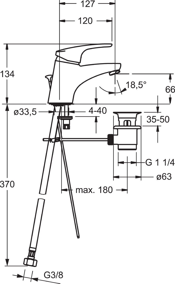 HANSAMIX wastafelmengkraan vaste uitloop met waste 3/8″flex, spr.127mm