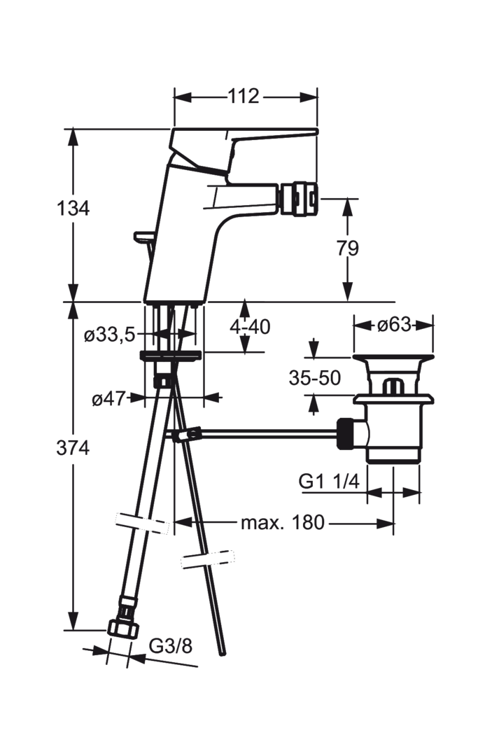 HANSATWIST bidetmengkraan, met vaste uitloop, met waste, gesloten hendel, 3/8″flexibele aansluitslangen, sprong 112mm